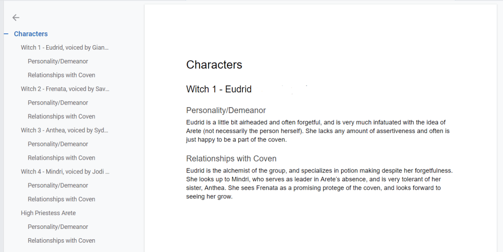 The pandemic made it difficult to record everything we needed, and time did make us cut our introductory scene, but it lives on in my documentation for future development: