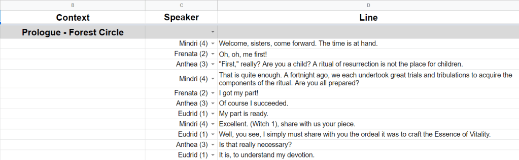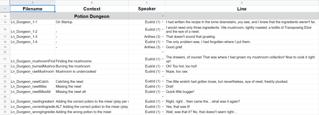 I mostly worked on documentation, which was plenty fun in its own right. I wrote all the dialogue present in the final build, and our Dialogue document was my living space: